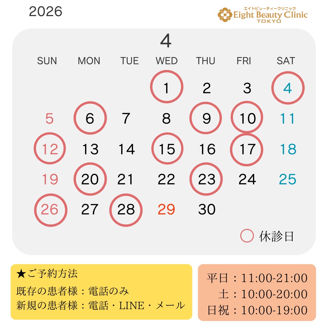 エイトビューティークリニックでは、 全てオリジナル施術メニューにて ご提供させていただいております。 最新の日本最速医療脱毛機を取り入れ、 安全性が高く、痛みの少ない 医療脱毛を行っております。 campaign campaign キャンペーン情報 reason reason 選ばれる理由 私たちが選ばれているのには、様々な理由があります。 日焼けした肌や うぶ毛でも脱毛可能 完全予約制・完全個室 ラグジュアリー空間でも脱毛可能 強引な勧誘は 一切ありません 施術者は全て資格保有の 医療従事者が担当 高品質の医療脱毛を 適正価格で 平日は21時まで 診療可能 完全予約制 待ち時間なし 新宿御苑前駅より 徒歩1分 選ばれる理由を見る menu menu メニュー 医療脱毛 medical hair removal 痛みややけどの心配がなく少ない回数でしっかりムダ毛のない肌に。 詳細を見る 点滴・注射 intravenous drip & injection 美肌・美白・保湿・血行促進等の効果が期待!吸収率が高く即効性があります。 詳細を見る 料金表 price 施術メニュー料金表です。 詳細を見る column column コラム 2026.02.25クレーター肌は改善できる?自力ケアの限界と美容医療での治療法・回数・ダウンタイムを解説 マスクを外す機会が増え、写真撮影や対面での予定で肌の凹凸が気… 2025.12.17医療ダイエットなのに痩せない?原因と正しい対処法を徹底解説 「医療ダイエットを始めたのに、全然痩せない…」そんな不安や焦… 2025.11.28医療ダイエットで人気の脂肪溶解注射!新宿で安心して受けるためのポイントとクリニック比較 「どうしてもお腹のお肉だけ痩せない」「夏なのに二の腕を出せな… 2025.11.14医療ダイエットでリバウンドする原因と対策!失敗しないための4つのコツ 「医療ダイエットに興味はあるけれど、リバウンドが心配」「せっ… 2025.11.01新宿でIPLフォトフェイシャルを受けるなら?おすすめクリニックを徹底比較! 「シミ・くすみ・毛穴が気になる」「整った素肌になりたい」そん… 2025.10.15【東京のおすすめ】ダーマペンでニキビ跡は何回で効果が出る?料金・施術内容を徹底解説 ダーマペンとは?東京で注目されるニキビ跡治療 … 2025.10.15リベルサスのダイエット効果とは?成功ポイントや飲み方、副作用を大解説 リベルサスは、本来2型糖尿病の治療薬として開発されましたが、… 2025.09.01美容クリニック検索アプリ「トリビュー」への掲載をしました こんにちは!エイトビューティークリニックです。 この度、美容… コラムを見る instagram instagram インスタグラム こんにちは! エイトビューティーク こんにちは! エイトビューティーク こんにちは! エイトビューティーク こんにちは☀️ エイトビューティー こんにちは! エイトビューティーク こんにちは! エイトビューティーク こんにちは! エイトビューティーク こんにちは☀️ エイトビューティー こんにちは! エイトビューティーク こんにちは! エイトビューティーク こんにちは! エイトビューティーク こんにちは☀️ エイトビューティー clinic guide clinic guide クリニック案内 東京メトロ新宿御苑前駅より徒歩1分 エイトビューティークリニック新宿院は、 非常にアクセスのしやすい場所にございます。 女性のお悩みに特化したクリニックとして 全てオリジナル施術メニューにてご提供させていただいております。 最新の日本最速医療脱毛機と有資格者が施術を担当いたしますので、 安心してお任せください。 クリニック案内を見る Access Access アクセス