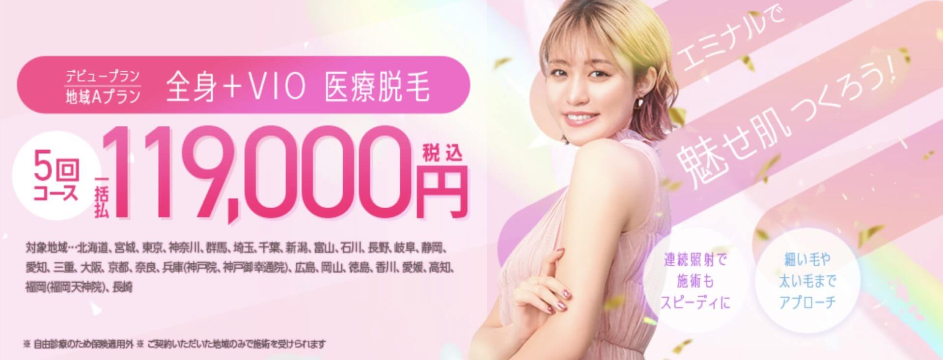 | 全身+VIO+顔脱毛 | 21箇所 | 5回 | 一括払い198,000円 (月々3,900円) |
