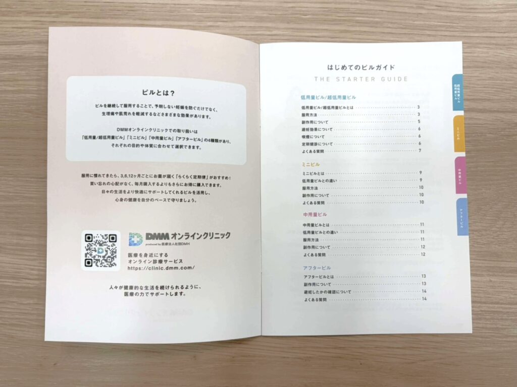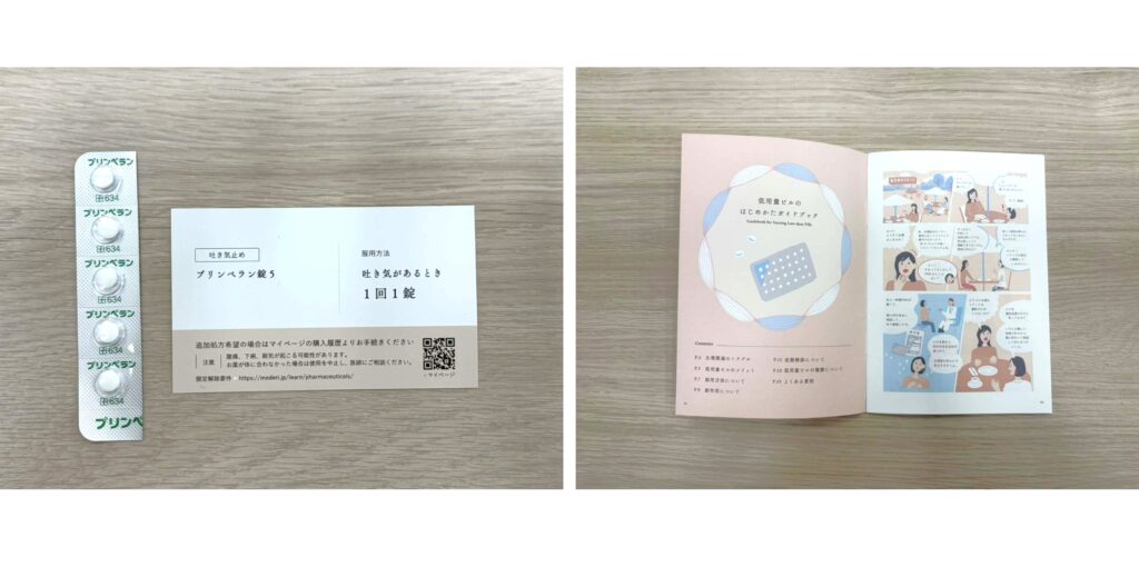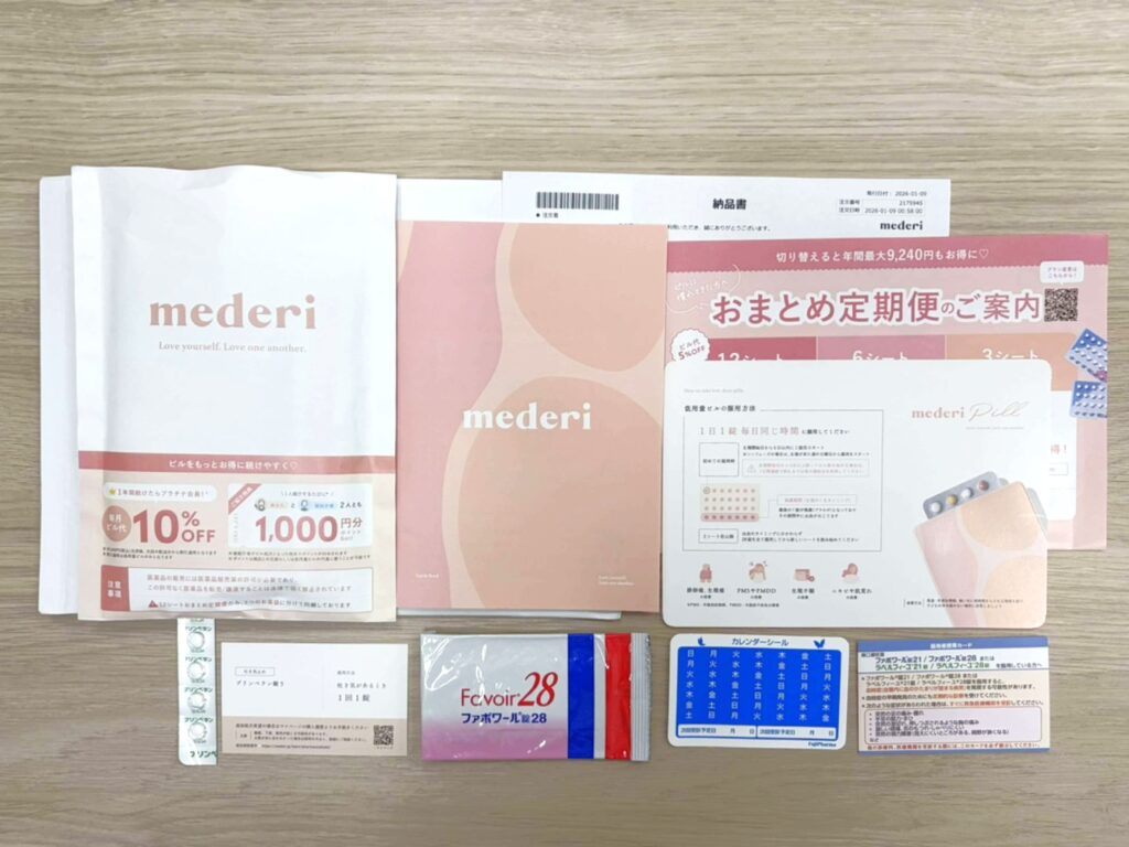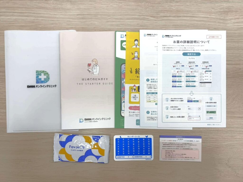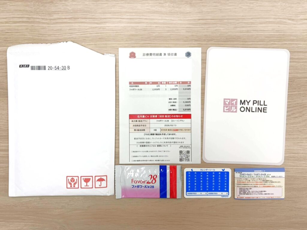 同梱物については非常に充実しており、各ピルの詳細が記載された詳しいガイドブックや定期便の案内、さらには今後の手続きに役立つマイページへの案内書類などが丁寧に同封されています。継続的な利用を検討されている方にとって、分かりやすく信頼できるサービス内容となっています。